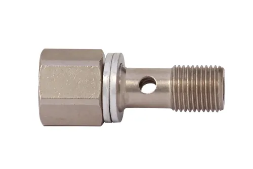 Doppelte BANJO-Schraube mit Dichtscheibe Typ D8 für Anschlüsse Typ R13, R14, D12, D17, D5, D6. Material: vernickeltes Messing. Betriebsdruck: 18 bar.