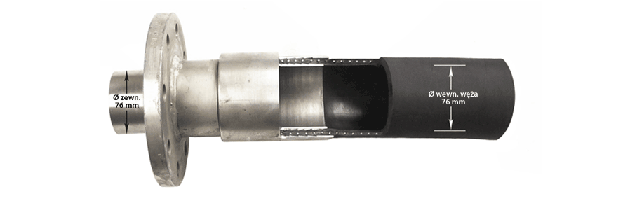 Die Erhöhung des Durchflusses verkürzt die Umladezeit des Mediums, was erhebliche wirtschaftliche Vorteile bietet. Ein weiterer wichtiger Vorteil ist das Fehlen von Hindernissen und Störungen des Durchflusses an der Kante des Anschlussschwanzes, was besonders bei der Anwendung mit Schüttgütern und halbflüssigen Materialien (Granulate, Getreide, Zement, Beton usw.) von Bedeutung ist. Das Innenverpressungssystem kann für die meisten Gummischläuche im industriellen Einsatz mit Durchmessern von 2″ (DN50) bis 12″ (DN300) verwendet werden, insbesondere für Wasser- und Luftschläuche, Kraftstoffschläuche und andere Erdölprodukte sowie für Schläuche zum Transport von Feststoffen und Lebensmitteln.