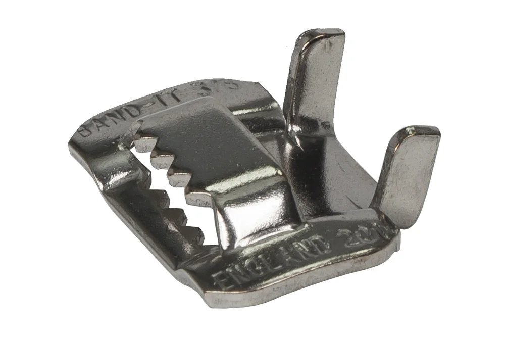 Band-It® Standard Bandverschlüsse. Verschlüsse mit sogenannten „Nasen“ sichern das Bandende nach dem Biegen. Material: AISI 316 Stahl.