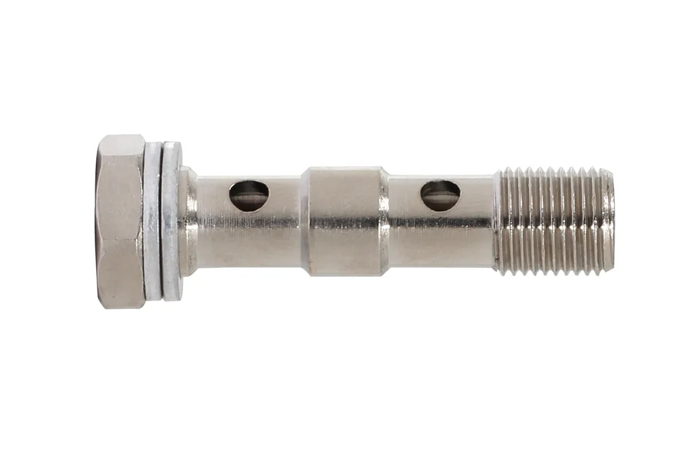 Doppelte BANJO-Schraube mit Dichtscheibe Typ D8 für Anschlüsse Typ R13, R14, D12, D17, D5, D6. Material: vernickeltes Messing. Betriebsdruck: 18 bar.