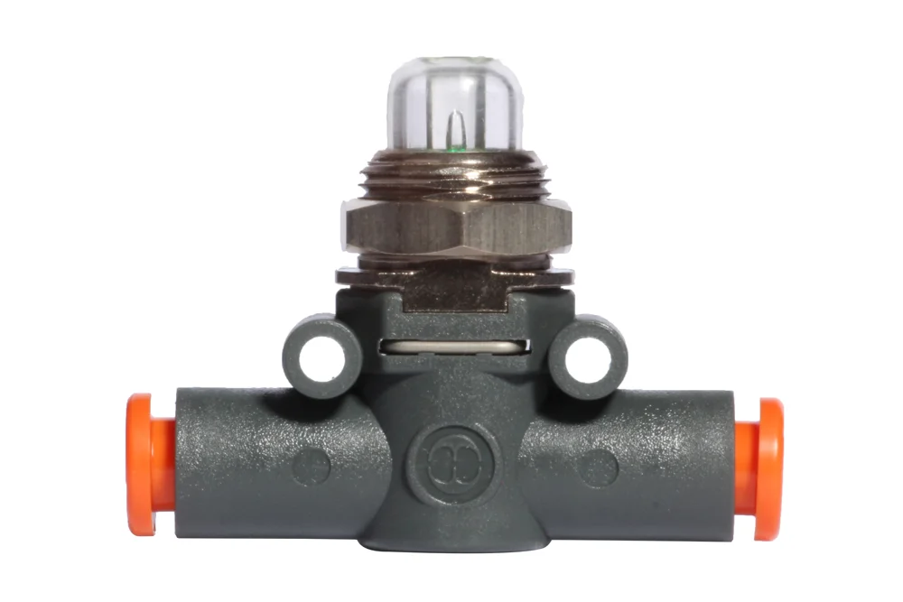 Der Druckanzeiger LAM L in der Ausführung mit beidseitigen Steckverbindern (Schlauch – Schlauch) dient zur Signalisierung (grünes oder oranges Signal) der Belüftung des Systems; wenn das System entlüftet ist, ist das Schauglas „leer“. Betriebsdruck: 2 ÷ 10 bar. Betriebstemperatur: von -20°C bis +60°C. Medium: gefilterte Druckluft, geölt oder ungeölt.