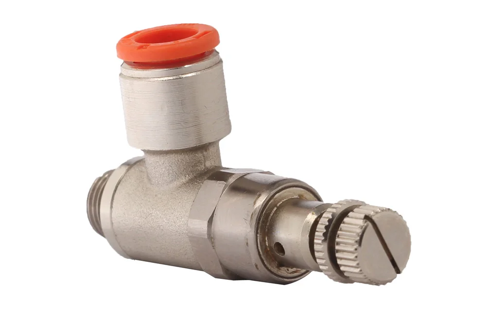 Miniatur-Winkelreduzierventil Typ RMC (Gewindeanschluss mit O-Ring am Eingang und Steckanschluss am Ausgang) gewährleistet durch seine Geometrie die Parallelität der Leitung zu den übrigen Installationselementen. Ausgangsdruckbereich: 1 ÷ 8 bar. Betriebsdruck: 10 bar. Betriebstemperatur: von -20°C bis +60°C. Medium: gefilterte Druckluft, geölt oder ungeölt.