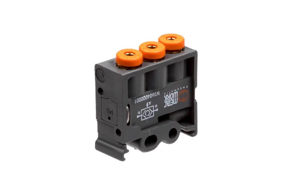 Logisches Element OR-oder. Steuerung durch Druckluft, Rückstellung durch Druckluft. Montage in beliebiger Position. Material: Gehäuse – Kunststoff, Kolben – Aluminium, Dichtung – NBR. Nenn-Durchfluss: 100 Nl/min bei 6 bar mit einem Druckabfall von 1 bar. Eingebaute Steckanschlüsse für 4 mm Schlauch. Betriebstemperatur: von -10°C bis +60°C. Betriebsdruck: 0 bis 8 bar. Steuerdruck: 1,5 bis 8 bar.