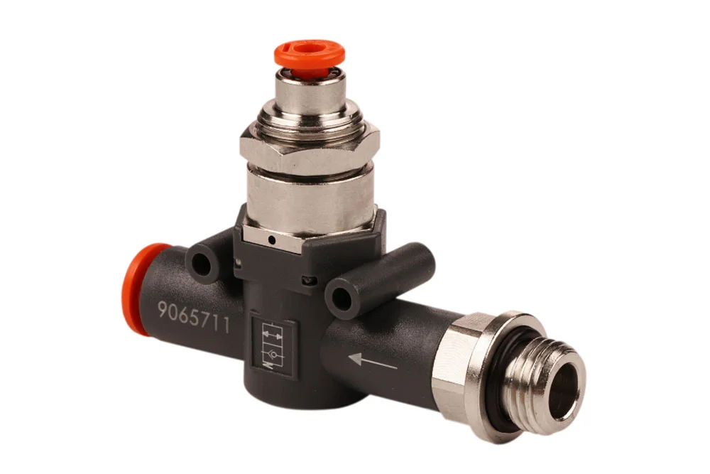 Absperrventil Typ STP L 2/2 unidirektional in der Ausführung mit Gewindeanschluss mit O-Ring auf einer Seite und Steckanschluss auf der anderen Seite (Gewinde – Leitung), vorgesehen für die direkte Montage im Versorgungsanschluss des Aktuators (gemäß der auf dem Ventilkörper durch einen Pfeil gekennzeichneten Flussrichtung). Ein korrekt angeschlossenes STP L Ventil ermöglicht den freien Durchfluss der Luft, die die Arbeitskammer des Aktuators versorgt, verhindert jedoch deren Entlüftung ohne Anlegen eines Steuerdrucks am Steckanschluss Ø4 (Ø5/32”). Betriebsdruck: 10 bar. Betriebstemperatur: von -20°C bis +60°C. Medium: gefilterte Druckluft, geölt oder ungeölt.
