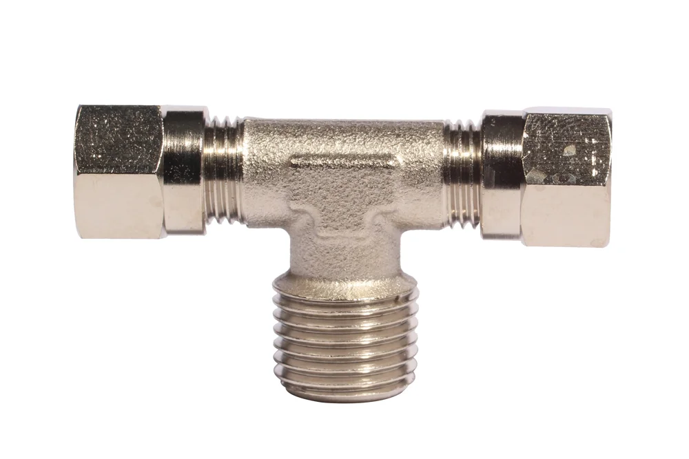 T-Stück-Anschluss mit Außengewinde BSPT Typ B7 mit Schneidring, geeignet zum Verbinden von Kupferrohren und Kunststoffschläuchen. Bei der Verbindung mit Schläuchen wird die Verwendung von Verstärkungshülsen (B12) empfohlen. Material: vernickeltes Messing. Betriebsdruck: 60 bar.
