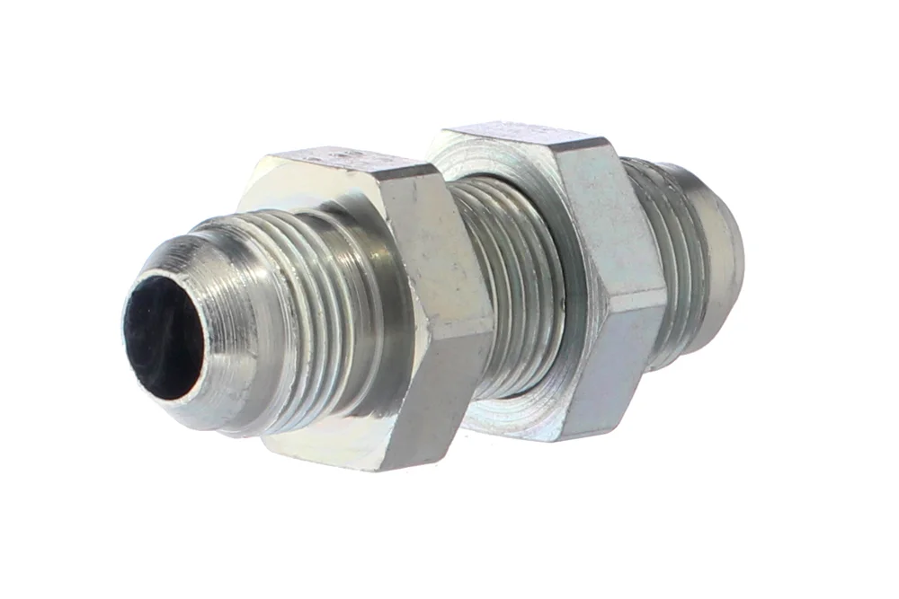 Gerade Schottverschraubung JIC 37° mit UNF Außengewinde (Dichtung auf 37° Kegel). Material: Kohlenstoffstahl, verzinkt.