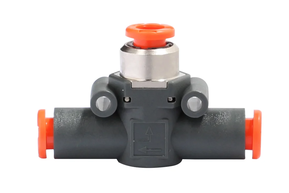 Schnellentlüftungsventil Typ VSR L in der Ausführung mit beidseitigen Steckverbindungen (Schlauch – Schlauch), Entlüftung über die Steckverbindung. Betriebsdruck: 10 bar. Betriebstemperatur: von -20°C bis +60°C. Medium: gefilterte Druckluft, geölt oder ungeölt.