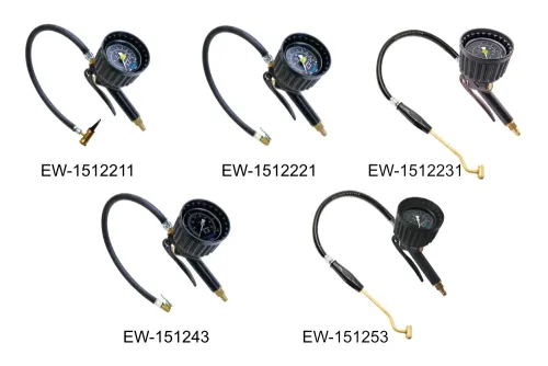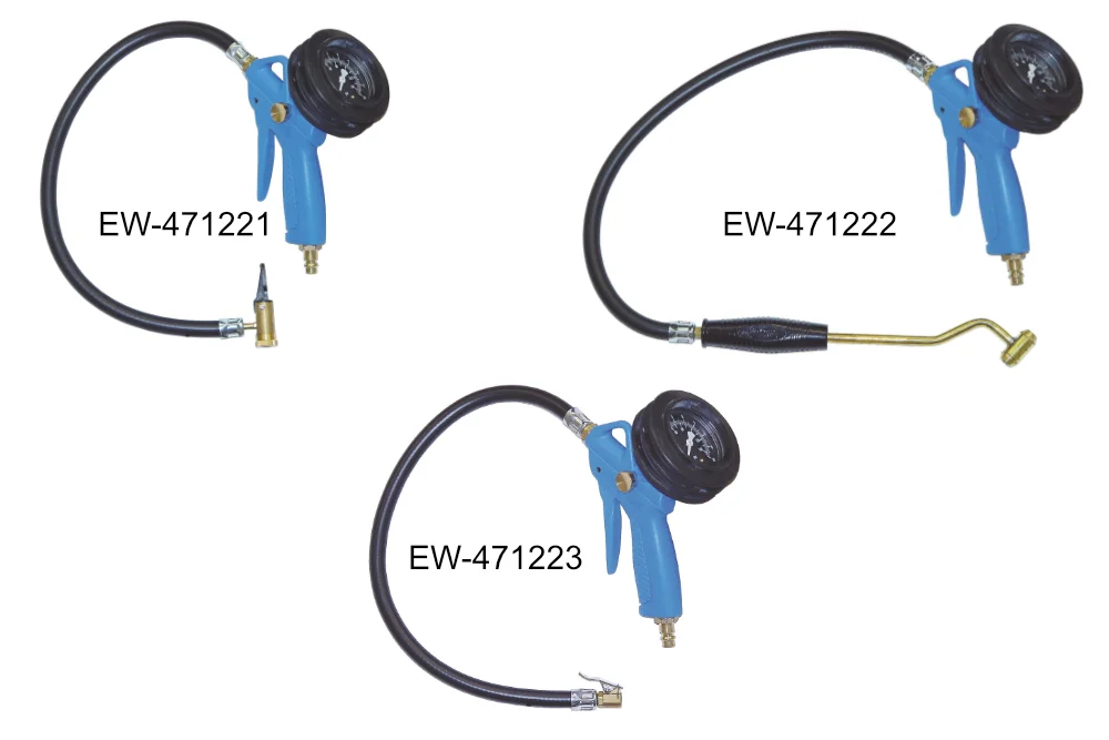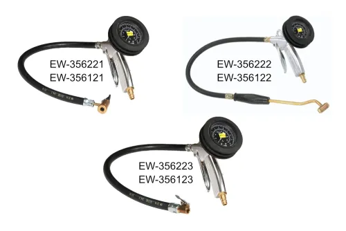 Funktionale und ergonomische Luftpistole zum Aufpumpen von Reifen – ohne Kalibrierung. Geeignet für alle Standard-Reifenventile VG 8 (PKW, Motorräder, Fahrräder usw.). Ausgestattet mit einem analogen Manometer 63 mm (Genauigkeitsklasse – 1,6) in einer Gummischutzhülle mit Doppelskala (bar, psi). Der leichte und handliche Pistolenrahmen besteht aus hochfestem Kunststoff. Das Befüllen des Reifens erfolgt durch Drücken des Hebels, das Ablassen hingegen über einen separaten Knopf am Pistolenrahmen (A). Zum Anschluss an den Reifen dient ein 500 mm langer Gummischlauch, der mit einem Drehgelenk an der Pistole befestigt ist. Material der Pistole: blauer Polyamid (PA6 GK30) verstärkt mit Glasfaser (Rahmen, Hebel), Hostaform@ C (Kolben). Dichtung: NBR, PU. Betriebsdruck: 10 bar (empfohlen: 4 ÷ 6 bar). Betriebstemperatur: von -10°C bis +50°C.