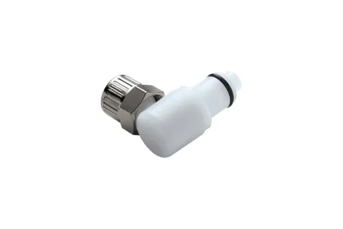 Ausführung wählen Dieses Produkt weist mehrere Varianten auf. Die Optionen können auf der Produktseite gewählt werden / DetailsMittelgroßer 90°-Stecker eines Schnellkupplungssystems mit Schlauchmutter, geeignet für Waschsysteme, Deionisierungswasserfiltration, Industrieautomaten, Leckagedetektion usw. Länge L [mm] - Gesamtlänge. Material: Polypropylen. Dichtung: EPDM-O-Ring. Betriebsdruck: bis zu 8,3 bar. Betriebstemperatur: von 0°C bis +71°C.