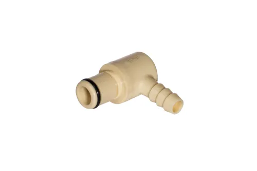 Ausführung wählen Dieses Produkt weist mehrere Varianten auf. Die Optionen können auf der Produktseite gewählt werden / DetailsMittelgroßer 90°-Stecker eines Schnellkupplungssystems ohne Ventil mit Schlauchanschluss, geeignet für Waschsysteme, Deionisierungswasserfiltration, Industrieautomaten, Leckagedetektion usw. Länge L [mm] - Gesamtlänge. Material: Polypropylen. Dichtung: EPDM-O-Ring. Betriebsdruck: bis zu 8,3 bar. Betriebstemperatur: von 0°C bis +71°C.