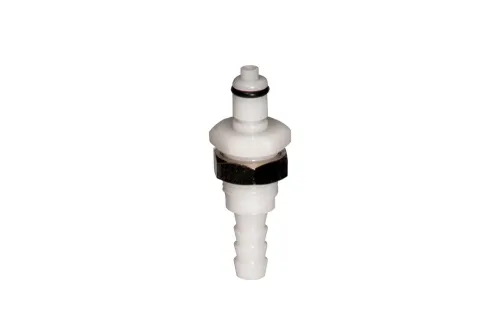 Ausführung wählen Dieses Produkt weist mehrere Varianten auf. Die Optionen können auf der Produktseite gewählt werden / DetailsWanddurchführung-Schnellkupplung mit Schlauchanschluss, ohne Ventil, geeignet für Druckertintenanlagen, Blut, Kühlflüssigkeiten, Gaschromatographie usw. Die Verbindung erfolgt durch Verdrehen der beiden Kupplungsteile zueinander. Ihre Konstruktion ermöglicht eine einfache Bedienung mit einer Hand, und das charakteristische Klicken gewährleistet eine sichere Verbindung. Es sind auch Versionen mit Ventil und in schwarzer Farbe erhältlich. Nennweite der Schnellkupplung: DN 1,2 mm. Länge L [mm] - Gesamtlänge. Material: Acetal. Dichtung: O-Ring NBR. Betriebsdruck: bis 6,9 bar. Betriebstemperatur: von -40°C bis +82°C.