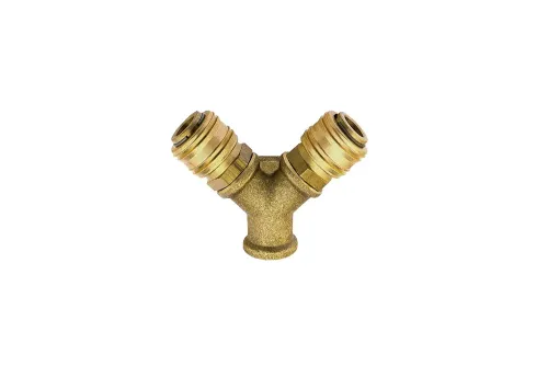 Ausführung wählen Dieses Produkt weist mehrere Varianten auf. Die Optionen können auf der Produktseite gewählt werden / DetailsY-Stück mit Innengewinde BSP und Eurostandard-Schnellkupplungssitzen DN7,2 zur Verwendung in Industrieanlagen, z.B. für Luft. Material: Messing. Betriebsdruck: bis 35 bar. Betriebstemperatur: bis +100°C.