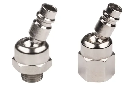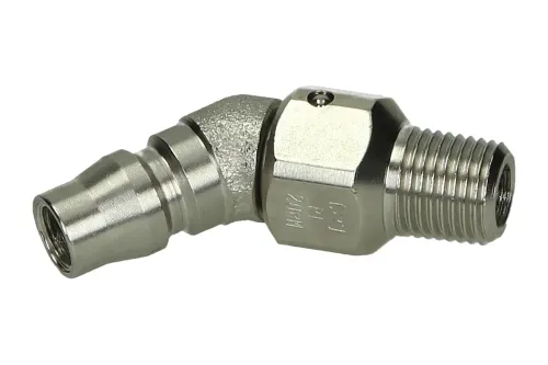 Ausführung wählen Dieses Produkt weist mehrere Varianten auf. Die Optionen können auf der Produktseite gewählt werden / DetailsGelenkstecker mit Außengewinde oder Innengewinde BSP mit einem Profil, das dem gängigen EURO-Standard DN7,2 entspricht. Die Möglichkeit einer 360°-Drehung verhindert effektiv das Verdrehen des angeschlossenen Schlauchs und ermöglicht eine freie Arbeit mit dem daran angeschlossenen pneumatischen Werkzeug. Die zusätzliche Möglichkeit der Positionierung des Steckers (maximale Neigung um 30°) ermöglicht auch die Montage an schwer zugänglichen Stellen, ohne das Risiko einer Schlauchknickung. Deutsche Qualität und die Ausführung aus vernickeltem Stahl sorgen für eine längere Lebensdauer als bei Standard-Messingsteckern. Diese Anschlüsse sind geeignet für den Einsatz mit Schlagschraubern (pneumatische Schlagschrauber, pneumatische Nagler usw.). Austauschbar mit allen nach Eurostandard DN7,2 ÷ 7,8 anderer Hersteller. Anwendung: Pneumatik (Luft, Stickstoff, andere nicht brennbare Gase). Betriebsdruck: 10 bar - max. 25 bar (Sicherheitsfaktor: 1,5). Durchfluss: 1090 l/min, Pe = 6 bar, Δp = 1 bar. Betriebstemperatur: von -20°C bis +80°C. Material: vernickelter Stahl.