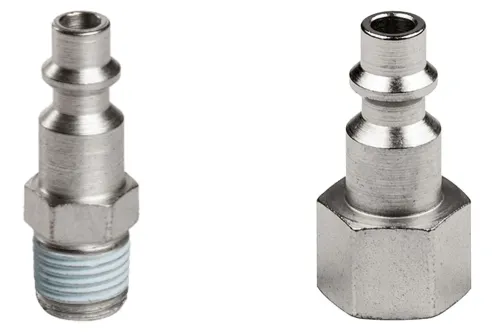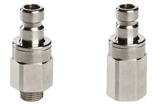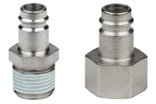 Ausführung wählen Dieses Produkt weist mehrere Varianten auf. Die Optionen können auf der Produktseite gewählt werden / DetailsSchnellkupplungsstecker ohne Ventil, DN5,5 mit Profil gemäß ISO 6150B (A-A-59439, MIL C-4109), Serie 1400KA / 1423KA, mit Außengewinde BSPT oder mit Innengewinde BSP. Hochwertiger Stecker, vielseitig im industriellen Bereich, hauptsächlich für Druckluft, einsetzbar. Betriebsdruck: 35 bar. Material: gehärteter, vernickelter Stahl. Betriebstemperatur: von -20°C bis +100°C.
