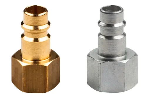Ausführung wählen Dieses Produkt weist mehrere Varianten auf. Die Optionen können auf der Produktseite gewählt werden / DetailsStecknippel des Schnellkupplungssystems mit dem gängigen Eurostandard-Profil DN7,2 ohne Ventil, mit Innengewinde BSP, zur Verwendung in pneumatischen Anlagen (Luft, Stickstoff, andere nicht brennbare Gase). Der Stecknippel ist in zwei Materialvarianten erhältlich: aus Messing und aus verzinktem Kohlenstoffstahl. Bei intensiver Nutzung, Vibrationen und pneumatischen Werkzeugen wird die Verwendung von Stecknippeln aus Kohlenstoffstahl empfohlen (geringerer Verschleiß). Die Schnellkupplungen sind austauschbar mit allen Schnellkupplungen anderer Hersteller gemäß Eurostandard DN7,2 ÷ 7,8 und kompatibel mit Werkzeugen, die in Geschäften erhältlich sind. Einfach mit einer Hand bis zu einem Druck von 8 bar zu bedienen. Betriebsdruck: 16 bar. Material: Messing oder verzinkter Kohlenstoffstahl. Betriebstemperatur: von -20°C bis +100°C.